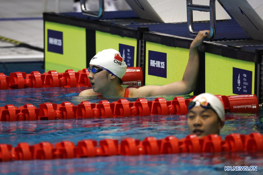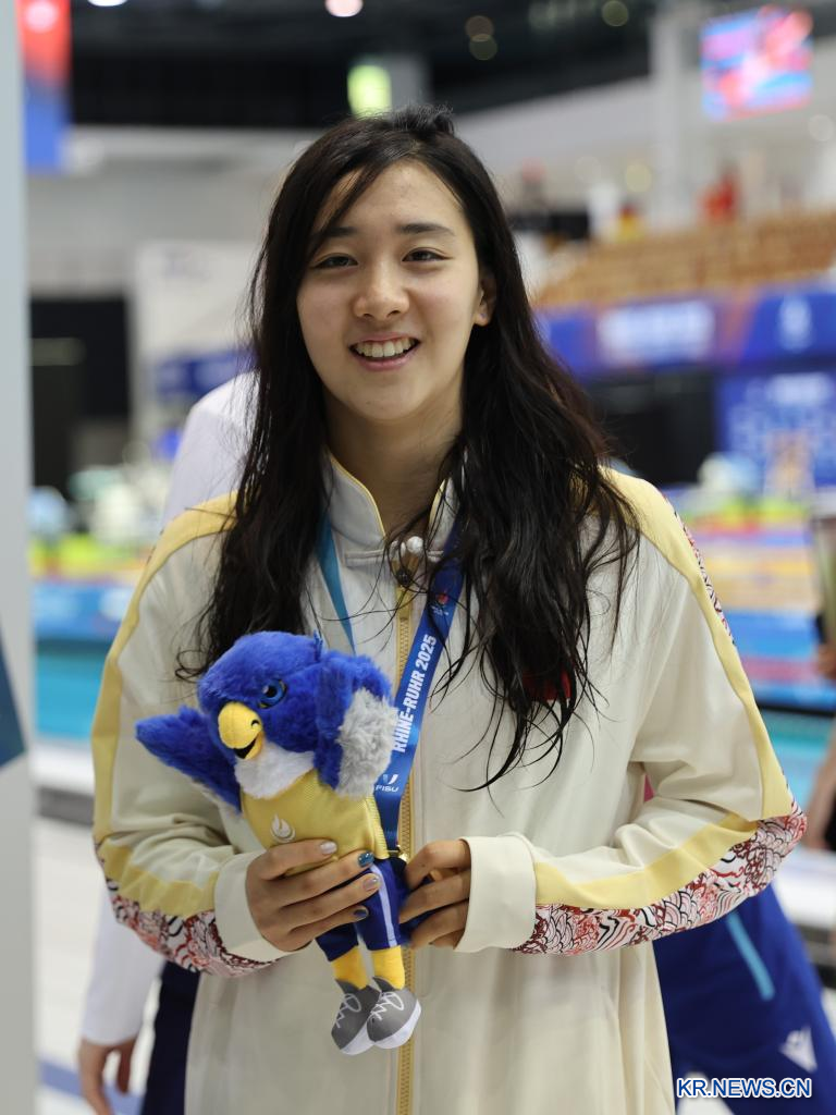 [신화망 베를린 7월21일] 아이옌한(艾衍含∙중국)이 19일(현지시간) 독일 베를린에서 열린 2025 라인-루르 하계 세계대학경기대회(유니버시아드) 여자 100m 자유형 결승에서 우승을 차지했다. 류수한(劉姝含)은 7위를 차지했다.[촬영/신화사 기자 두저위(杜哲宇)]