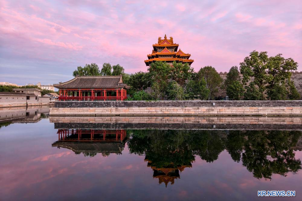 이날 저녁 노을을 머금은 베이징 고궁 동북각루(角楼)의 모습을 휴대전화에 담았다. 2025.7.20