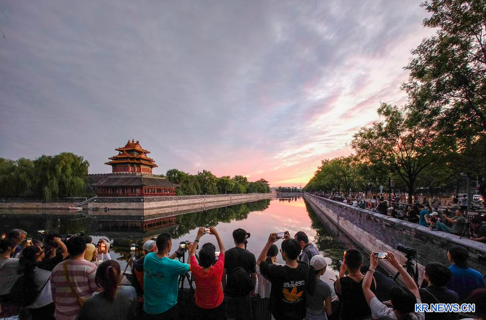 [신화망 베이징 7월21일] 20일 저녁 노을을 머금은 베이징 고궁 동북각루(角楼)를 촬영하는 사람들을 휴대전화에 담았다.