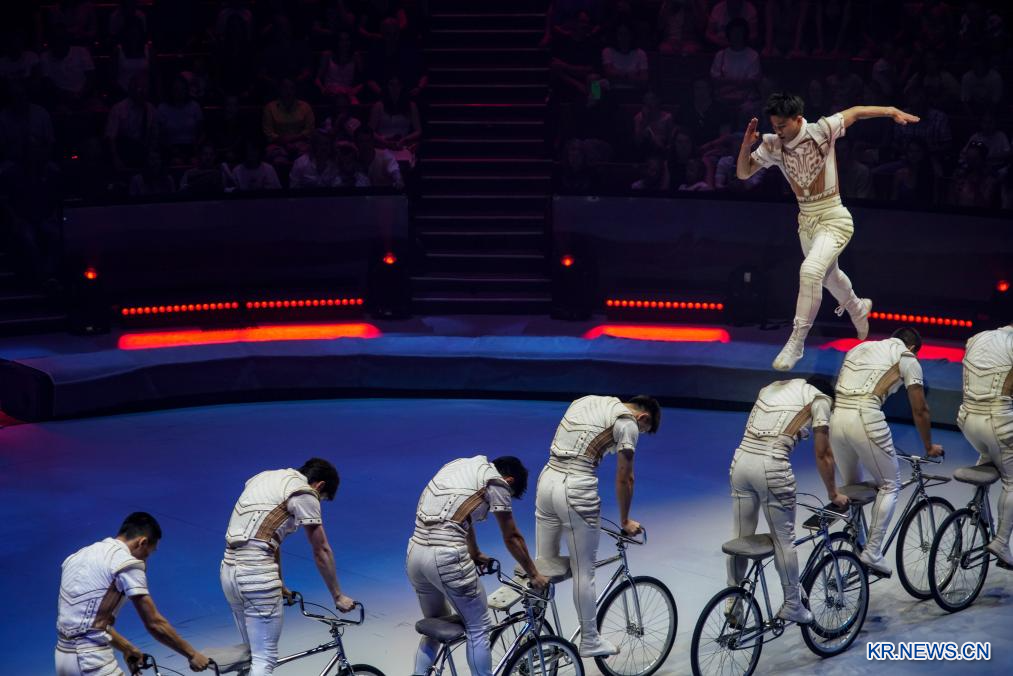 20일 러시아 모스크바에서 중국 서커스단이 펼치는 '위펑링샤오-남자 자전거 곡예' 공연. 2025.7.21