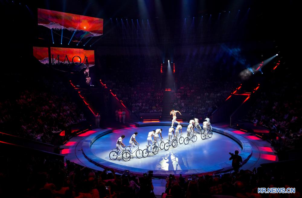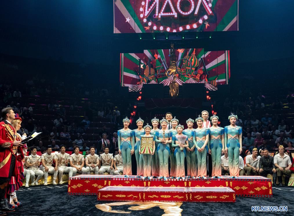 (모스크바=신화통신) 20일 러시아 모스크바에서 후난(湖南)성 서커스예술극원 배우들이 수상 후 단체 사진을 찍고 있다.