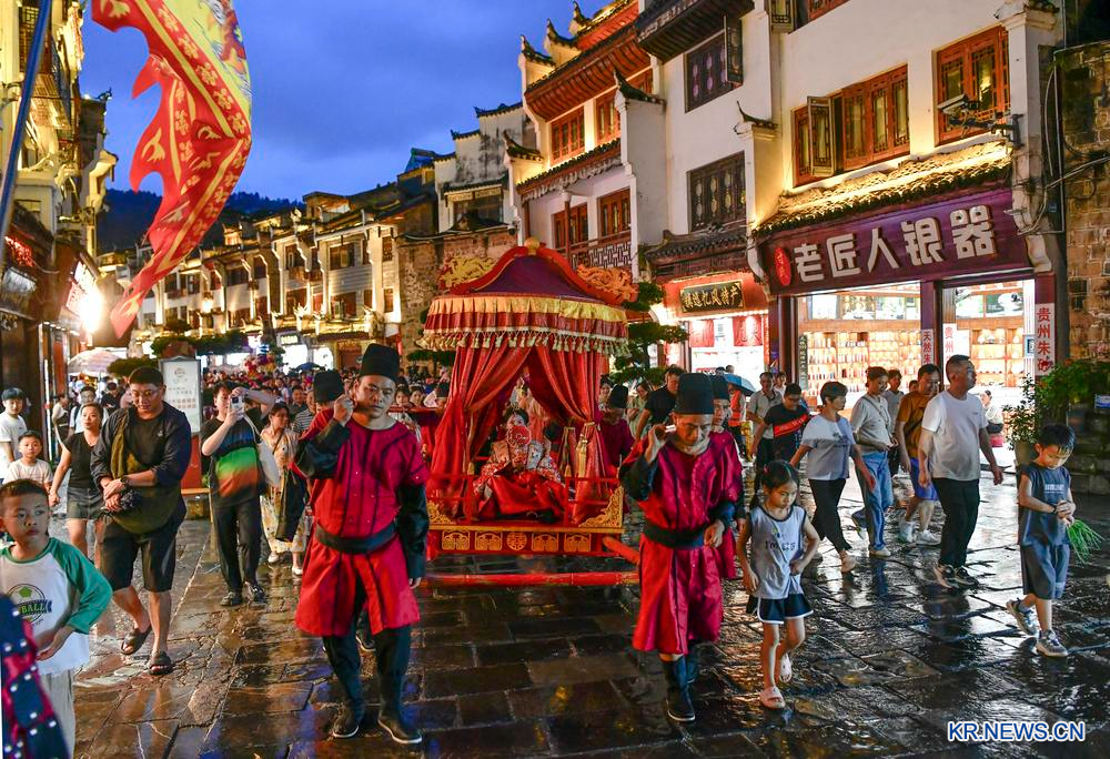 22일 구이저우(貴州)성 첸둥난(黔東南)먀오(苗)족둥(侗)족자치주 전위안(鎮遠)고성에서 현지 주민들이 민속 퍼레이드 공연을 펼치고 있다.