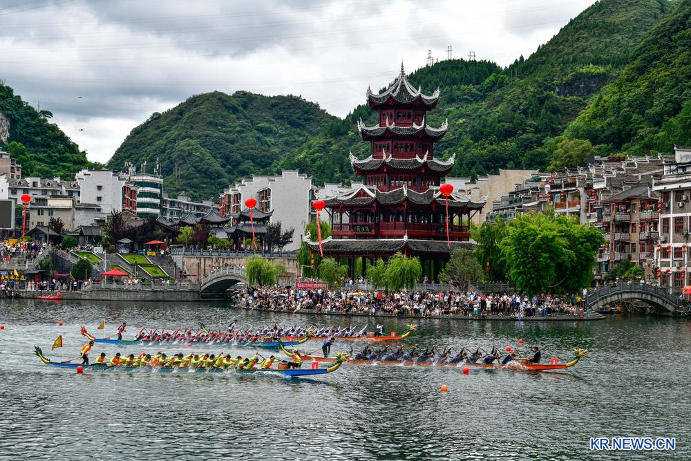 [신화망 전위안 7월23일] '2025년 중국 민족건강체육대회 전국 용선경기'가 22일 구이저우(貴州)성 첸둥난(黔東南)먀오(苗)족둥(侗)족자치주 전위안(鎮遠)고성에서 개막했다. 전국 각지에서 온 10개 용선팀은 전위안고성의 우양허(㵲陽河)에서 이틀간 각축을 벌일 예정이다. 아울러 대회 기간엔 무형문화유산 공연 등 다채로운 행사가 열린다.