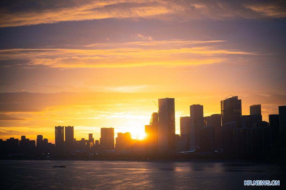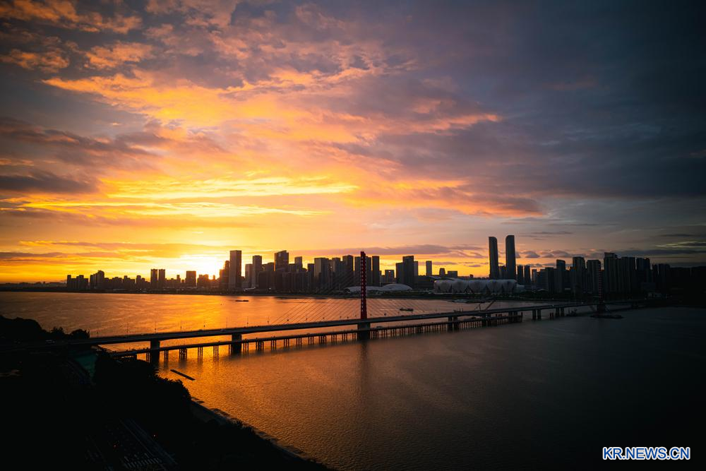 22일 저장(浙江)성 항저우(杭州)시 첸탕(錢塘)강 강변이 아침 노을로 붉게 물들었다.