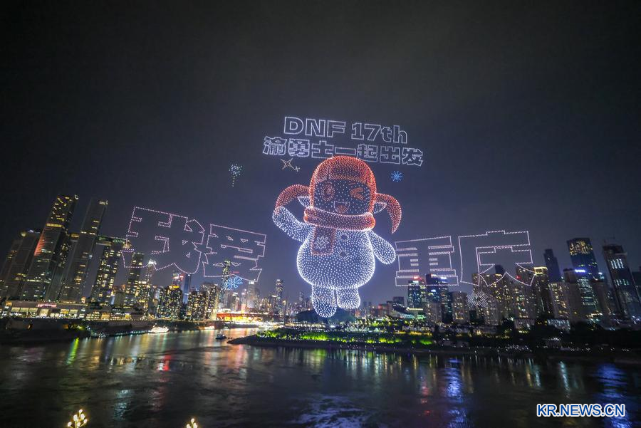 밤 9시가 되자 충칭시 룽먼하오(龍門浩) 옛 거리 강변에 모인 전 세계 관광객들이 스마트폰으로 드론 라이트 쇼를 촬영하기 시작한다. 5천 대의 드론이 하늘에 그리는 손오공, 너자(哪吒), 자이언트판다 등의 이미지가 장관이다.