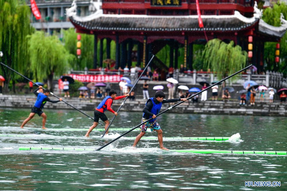 [신화망 전위안 7월24일] 2025년 중국 민족건강체육대회 독죽표(獨竹漂, 대나무 하나로 강 건너기) 대회가 22~23일 구이저우(貴州)성 첸둥난(黔東南)먀오(苗)족둥(侗)족자치주 전위안(鎮遠)고성에서 열렸다. 본 대회에는 중국 각지에서 온 10개 독죽표 대표팀이 참가했다.