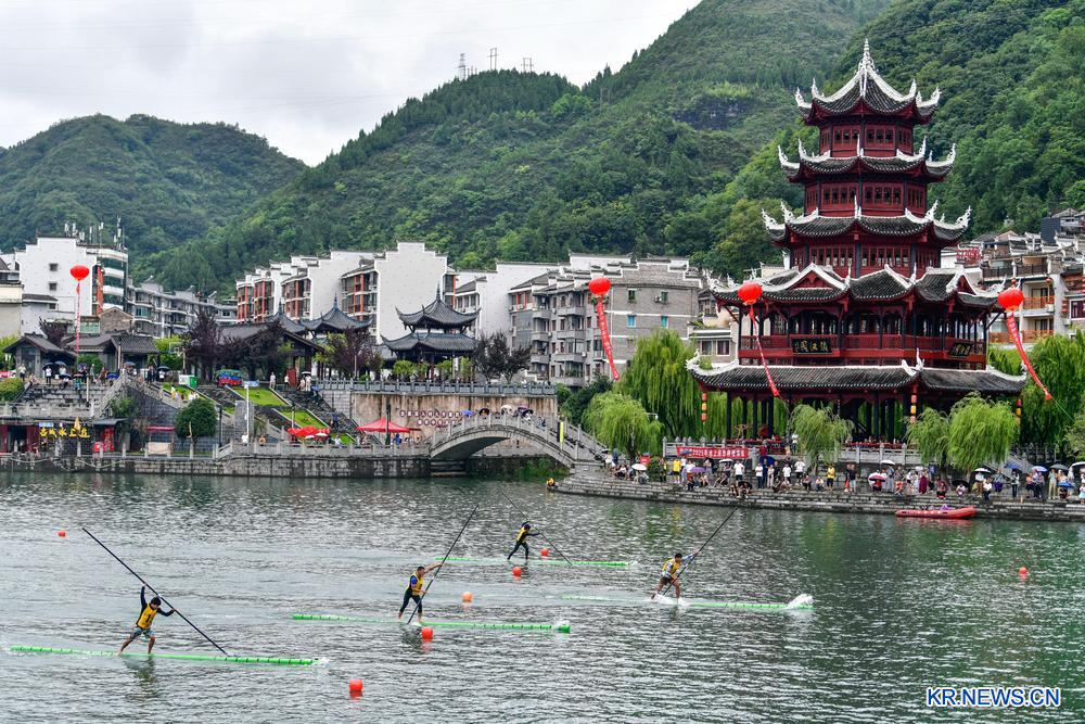 23일 구이저우(貴州)성 첸둥난(黔東南)먀오(苗)족둥(侗)족자치주 전위안(鎮遠)현 우양허(㵲陽河)에서 펼쳐진 독죽표(獨竹漂, 대나무 하나로 강 건너기) 경기.