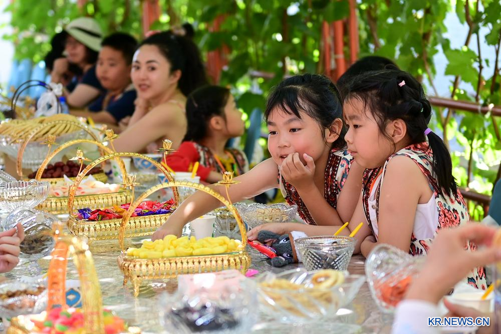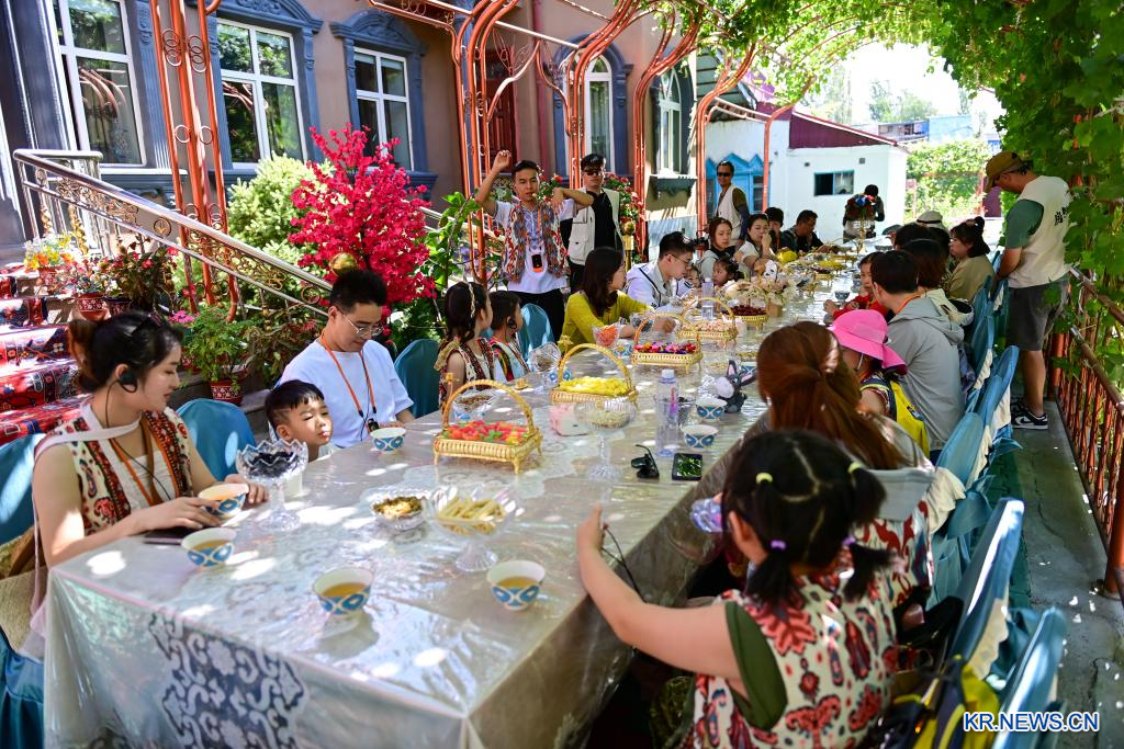 23일 관광객들이 신장(新疆)위구르자치구 이닝(伊寧)시 이리(伊犁)옛도시 카짠치(喀贊其)문화관광구에서 현지 음식을 맛보고 있다.