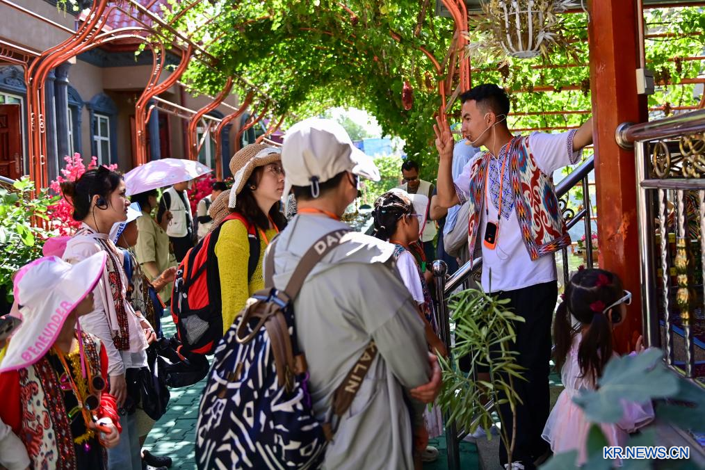 [신화망 이닝 7월25일] 신장(新疆)위구르자치구 이닝(伊寧)시가 문화·관광의 융합 발전을 추진하며 옛 도시에 활력을 불어넣고 있다. 9곳의 문화재 및 160개의 시(市)급 이상 무형문화유산 자원의 보호·전승을 추진하고 수공업을 문화창의 산업으로 업그레이드했다. 옛 건축물과 특색 민가를 바탕으로 '정원 경제'를 구축해 많은 일자리가 창출됐다.