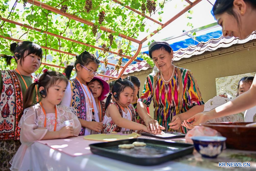 23일 신장(新疆)위구르자치구 이닝(伊寧)시 이리(伊犁)옛도시 카짠치(喀贊其)문화관광구를 찾은 관광객들이 현지 과자를 만드는 법을 배우고 있다.