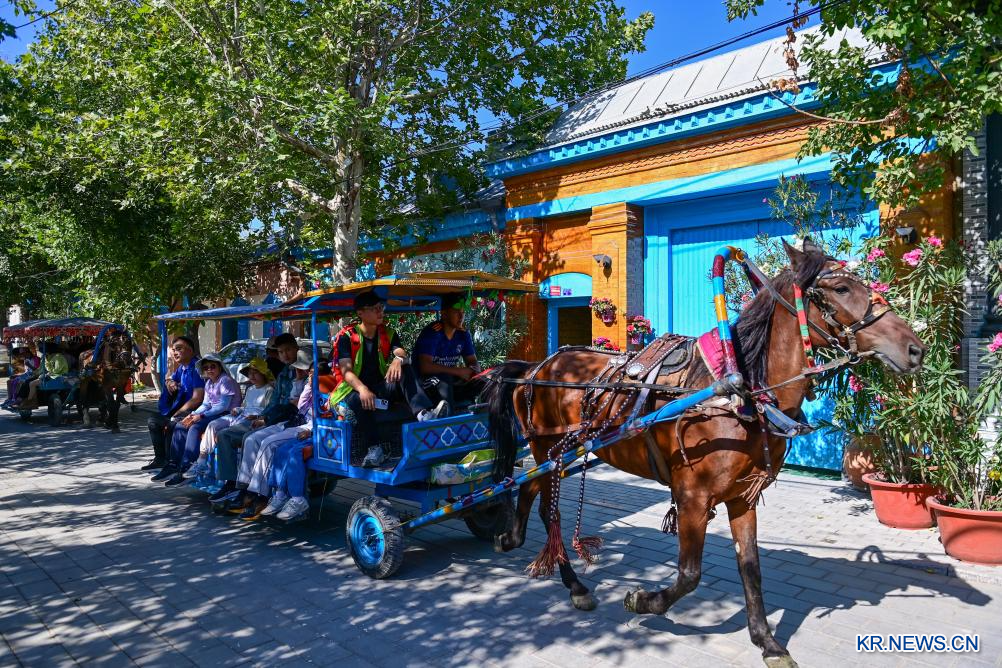 23일 신장(新疆)위구르자치구 이닝(伊寧)시 이리(伊犁)옛도시 카짠치(喀贊其)문화관광구에서 말을 타고 관광 중인 관광객.