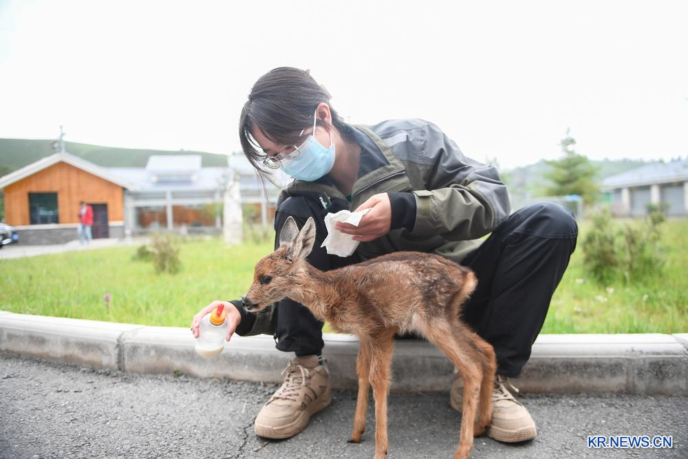 23일 치롄산(祁連山) 국가공원 야생동물 구호번식소에서 관리자가 구조된 새끼 노루에게 야크 우유를 먹이고 있다.