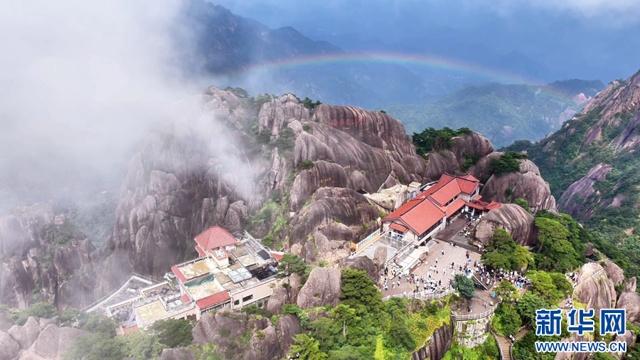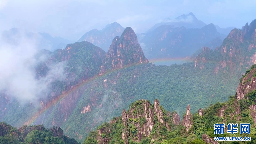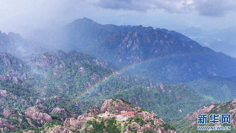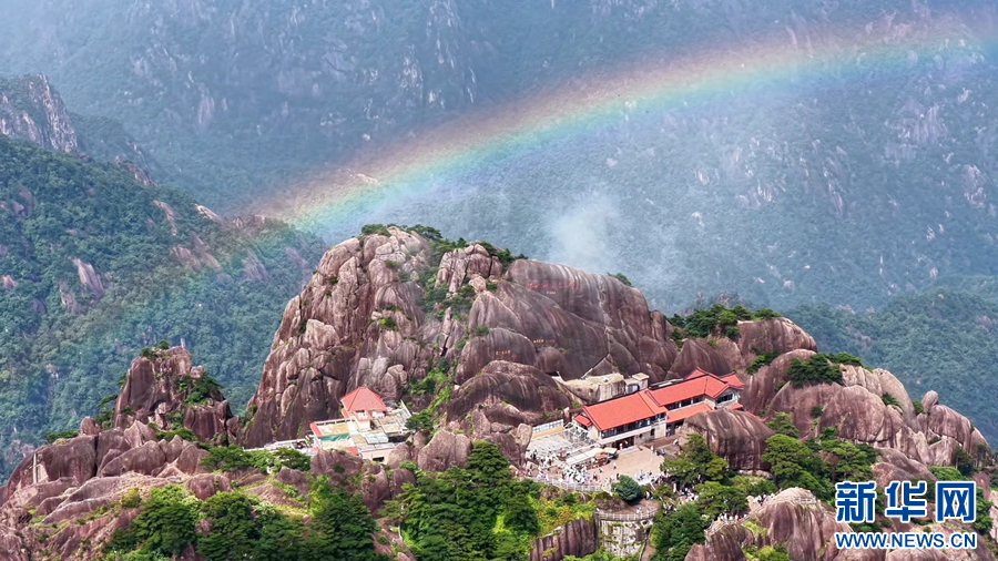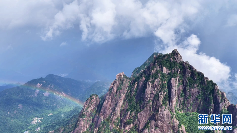 [신화망 베이징 7월27일] 최근 황산 풍경구에 비가 온 뒤 무지개가 떴다. 일곱 빛깔 무지개가 하늘의 다리처럼 푸른 봉우리와 계곡에 걸려 몽환적인 여름 풍경을 연출하고 있다.