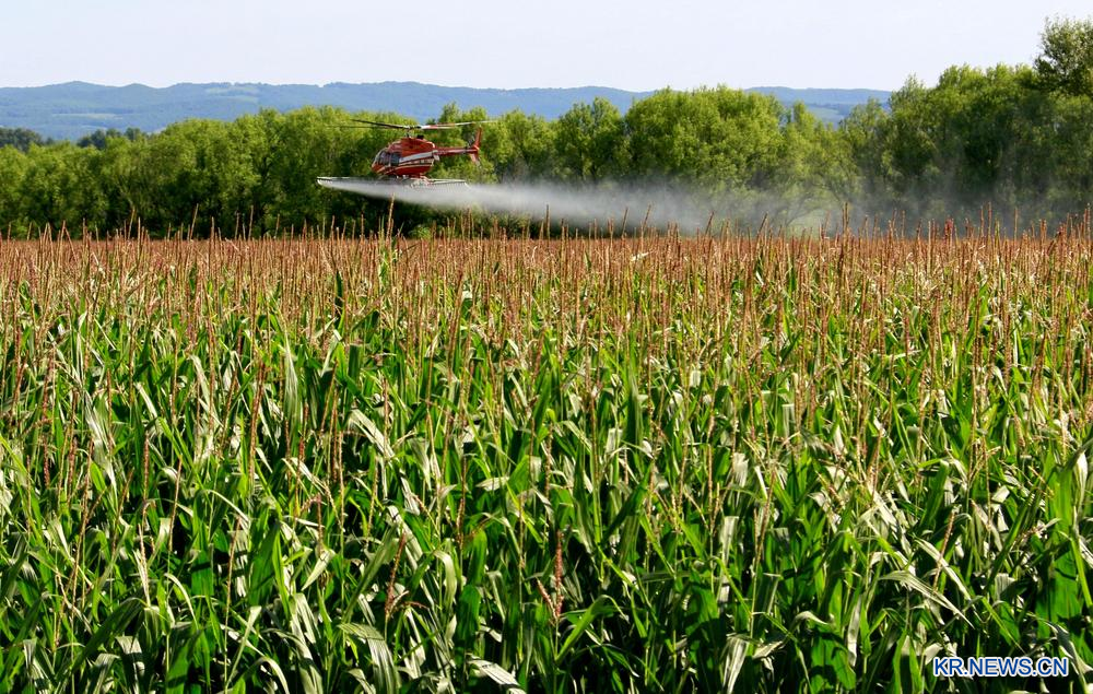 [신화망 하얼빈 7월28일]27일 농업용 헬리콥터가 베이다황(北大荒)그룹 헤이룽장(黑龍江) 웨이산(尾山)농장회사 옥수수밭에서 작업을 수행하고 있다.
