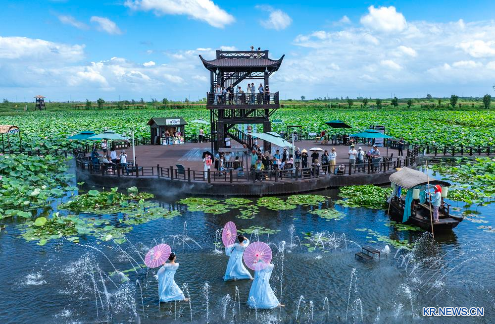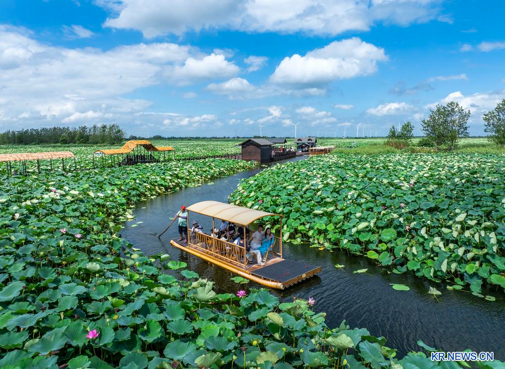 26일 장쑤(江蘇)성 싱화(興化)시의 한 연못 관광지에서 유람하고 있는 여행객을 드론으로 내려다봤다. 2025.7.26