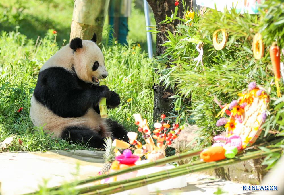 [신화망 화잉 7월28일] 자이언트 판다 '린시(林溪)'와 '이자(一家)'가 27일 쓰촨(四川)성 광안(廣安)시 화잉산(華鎣山)판다원에서 각각 4살과 6살 생일을 맞이했다. 이에 사육사가 두 판다를 위해 특별한 생일파티를 열었다.