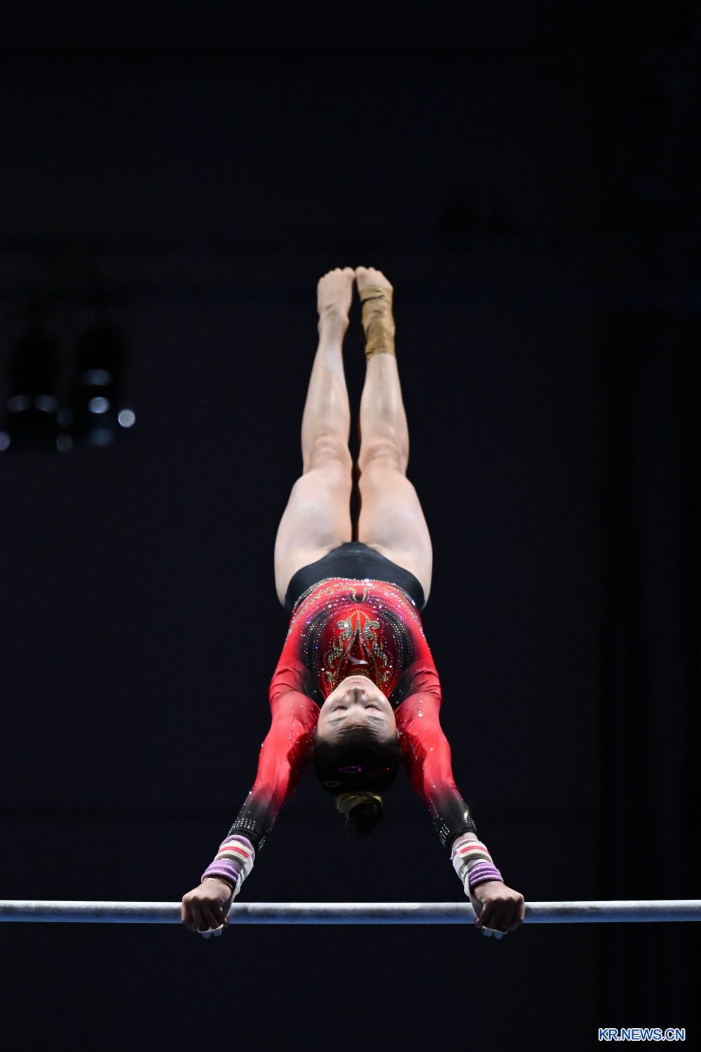 26일(현지시간) 양판위웨이(楊凡予微)가 이단평행봉 연기를 펼치고 있다. [촬영/신화사 기자 롄이(漣漪)]