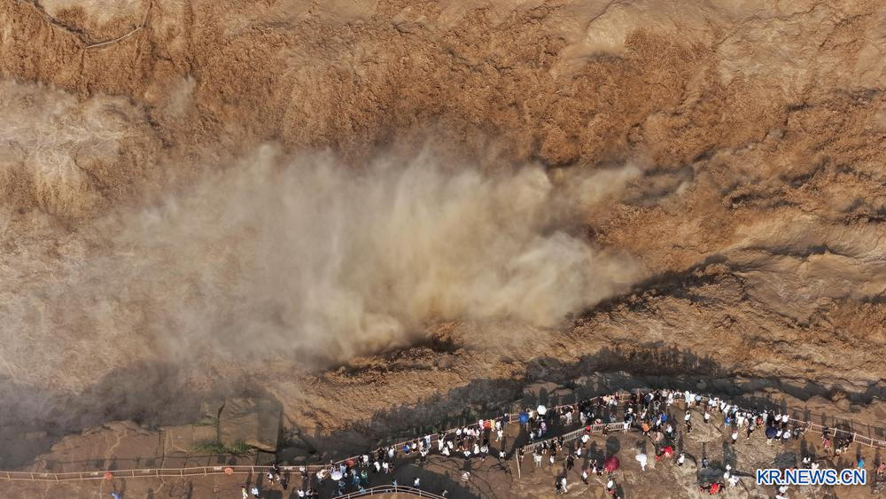 최근 상류 지역 강우의 영향으로 황허 진산(晉陝)대협곡의 수량이 크게 늘어나면서 산시성 지현과 산시(陜西)성 이촨(宜川)현 경계에 위치한 후커우 폭포가 여름철 범람기를 맞았다. 2025.7.27