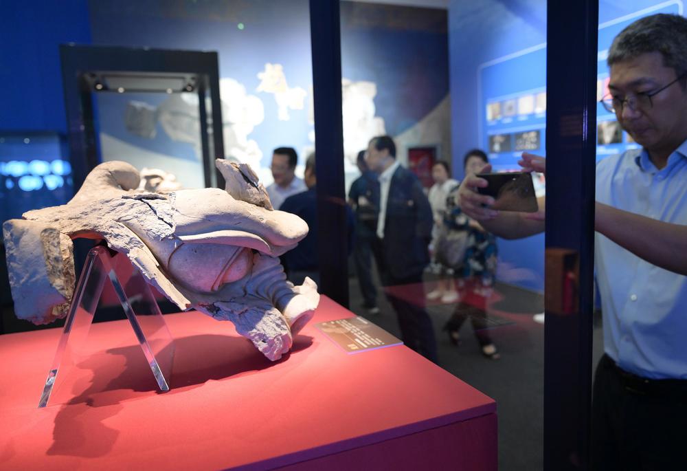 [신화망 베이징 7월29일]28일 허베이(河北)성 슝안(雄安)신구에 위치한 고주성(古州城)유적에서 출토된 당나라 용머리 조각상을 둘러보는 관람객들.