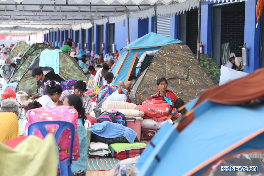 28일 태국 국경 지역 부리람주에서 현지 주민이 피란소로 지정된 체육관에 모여있다.