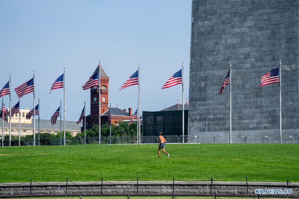 지난 6월 23일 미국 수도 워싱턴에서 한 남성이 잔디밭 위를 달리고 있다.