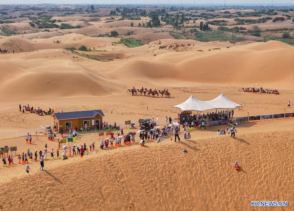 [신화망 어얼둬쓰 8월3일] 네이멍구(內蒙古)자치구 어얼둬쓰(鄂爾多斯)시 쿠부치(庫布其)사막이 관광 성수기를 맞았다. 특히 인컨타라(銀肯塔拉)와 샹사완(響沙灣) 관광지를 찾는 관광객들의 발길이 끊임없이 이어지고 있다.