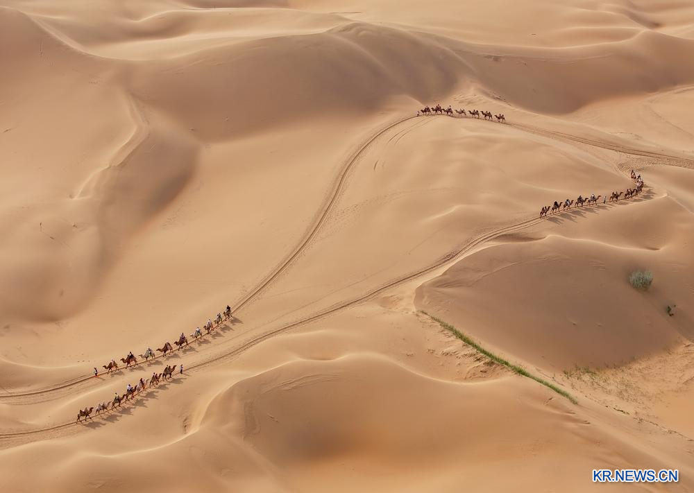 샹사완(響沙灣) 관광지에서 낙타 체험 중인 관광객을 1일 드론으로 내려다봤다.