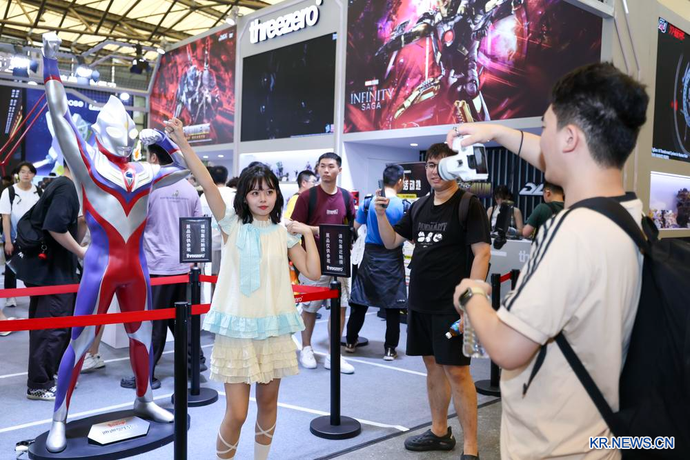 1일 '제22회 중국 국제디지털 인터랙티브 엔터테인먼트 전시회(CHINAJOY)' 현장에서 관람객이 울트라맨 모형 앞에서 기념사진을 찍고 있다.