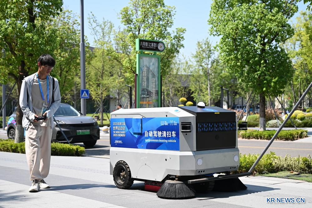 3일 청두 월드게임 선수촌에서 운행 중인 자율주행 청소차.