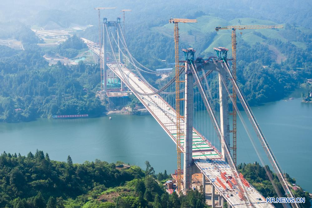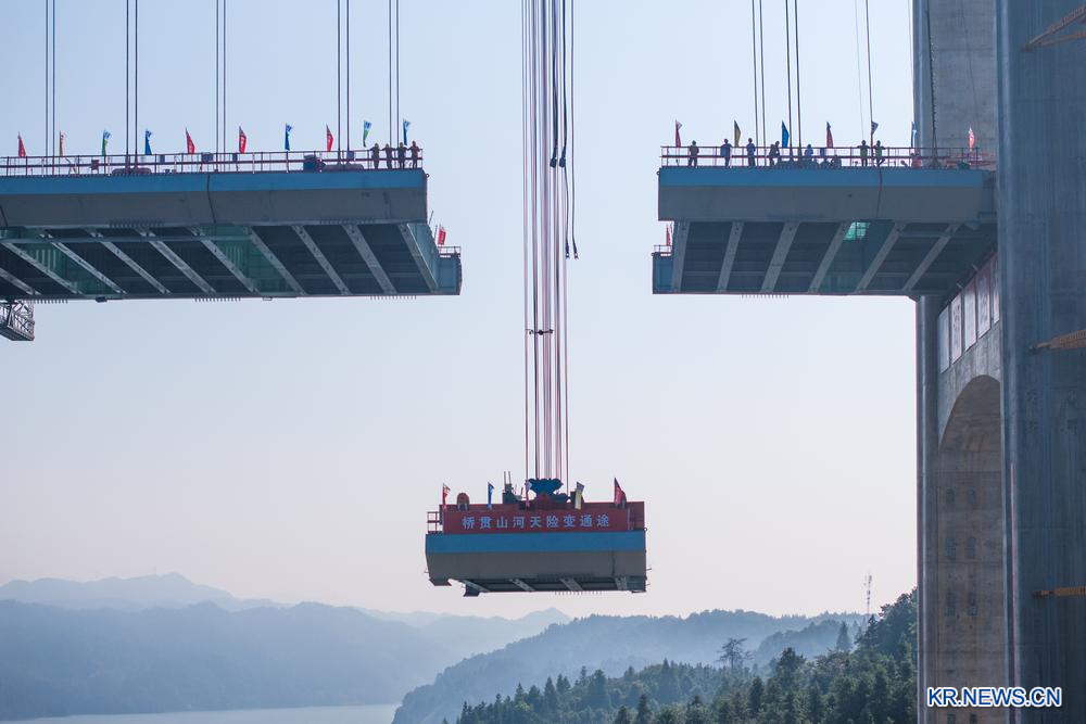[신화망 창사 8월4일] 장관(張官)고속도로 프로젝트 둥팅시(洞庭溪) 위안수이(沅水) 특대교의 주 교량이 3일 접합됐다. 장자제(張家界)와 관좡(官莊)을 잇는 장관고속도로는 G59 후허하오터(呼和浩特)~베이하이(北海) 고속도로의 핵심 구간으로 간선 전체 길이가 약 82㎞, 설계 속도가 시속 100㎞에 달한다.