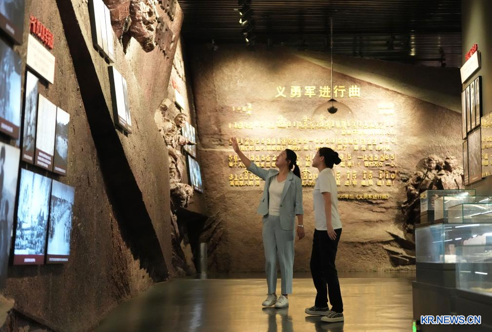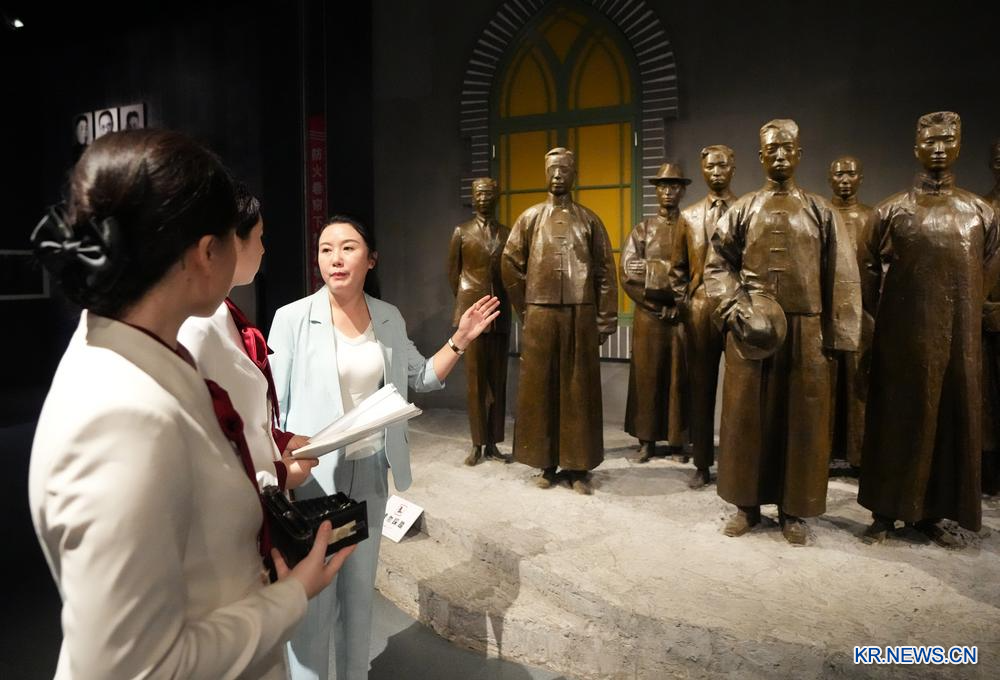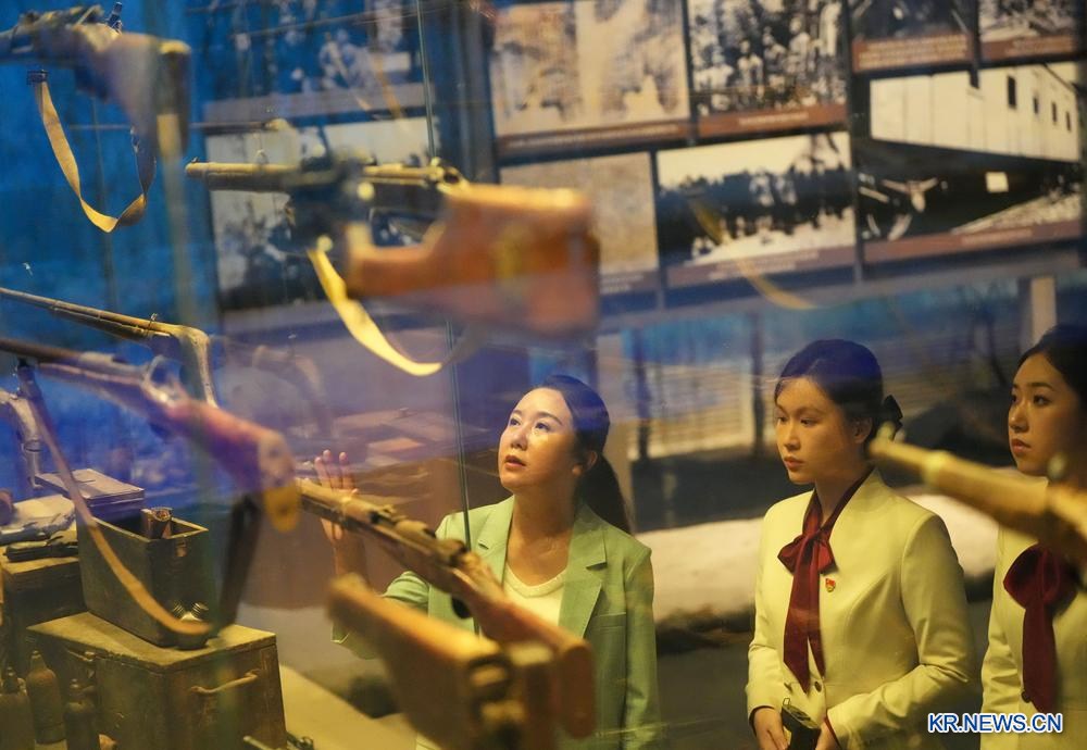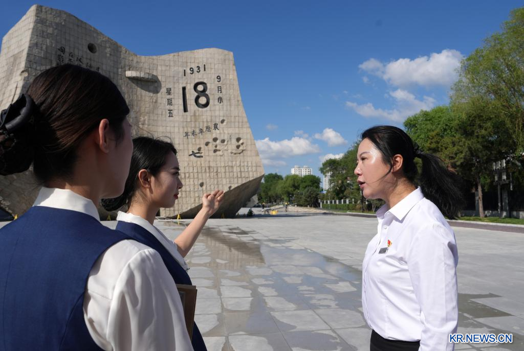 지난달 28일 스 주임이 '9·18' 역사박물관에서 동료들과 해설 내용에 대해 의견을 나누고 있다. 2025.8.5