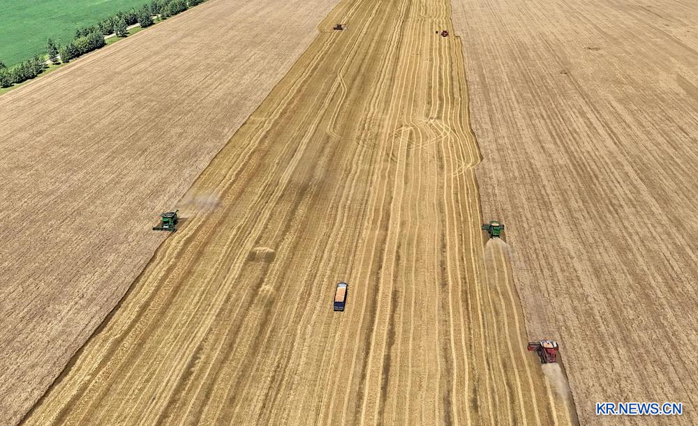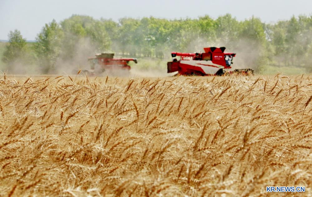[신화망 하얼빈 8월6일] 최근 헤이룽장(黑龍江)성의 밀이 본격적인 수확기에 접어들었다. 일부 밀 재배 지역에서는 맑은 날씨를 틈타 밀 수확을 서두르고 있으며 대형 콤바인이 밀밭을 가로지르며 수확 작업으로 분주한 모습이다.