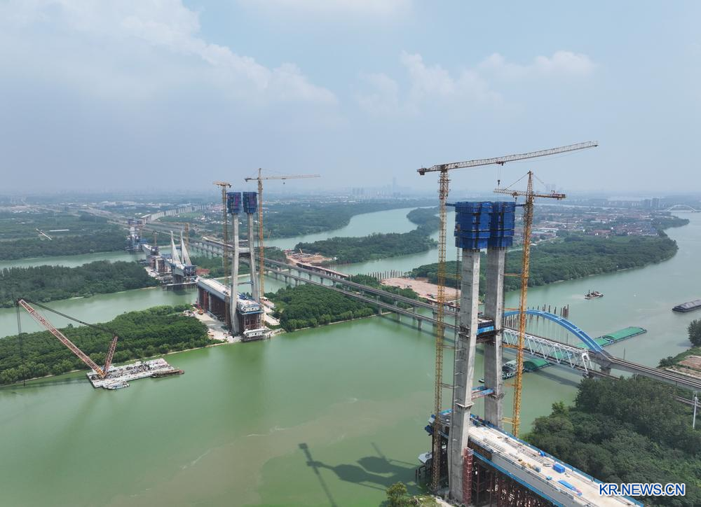 [신화망 양저우 8월7일] 중국철건(鐵建) 대교국이 건설하는 후위룽(滬渝蓉·상하이~충칭~청두)고속철도 징항(京杭·베이징~항저우)운하 횡단 사장교의 상량 작업이 5일 순조롭게 끝났다. 해당 사장교의 길이는 564.3m, 주경간 길이는 300m로 설계됐다.