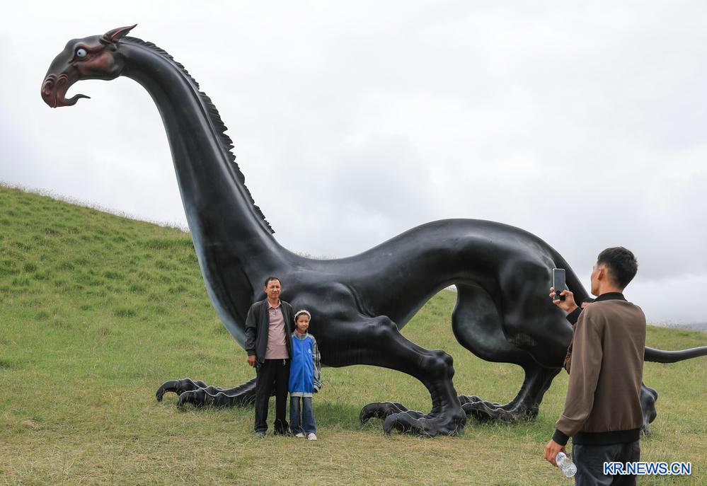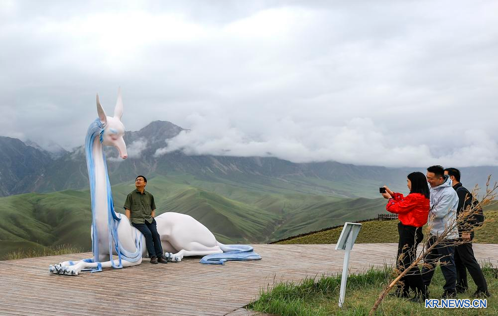 6일 쿤룬산관광지를 방문한 관광객들이 인증샷을 찍고 있다. 2025.8.7
