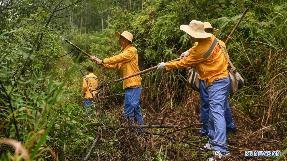 6일 친저우(欽州) 통신 담당 직원들이 통신 장비 주변에서 화재 방지를 위해 쓰러진 초목 제거 작업을 펼쳤다.