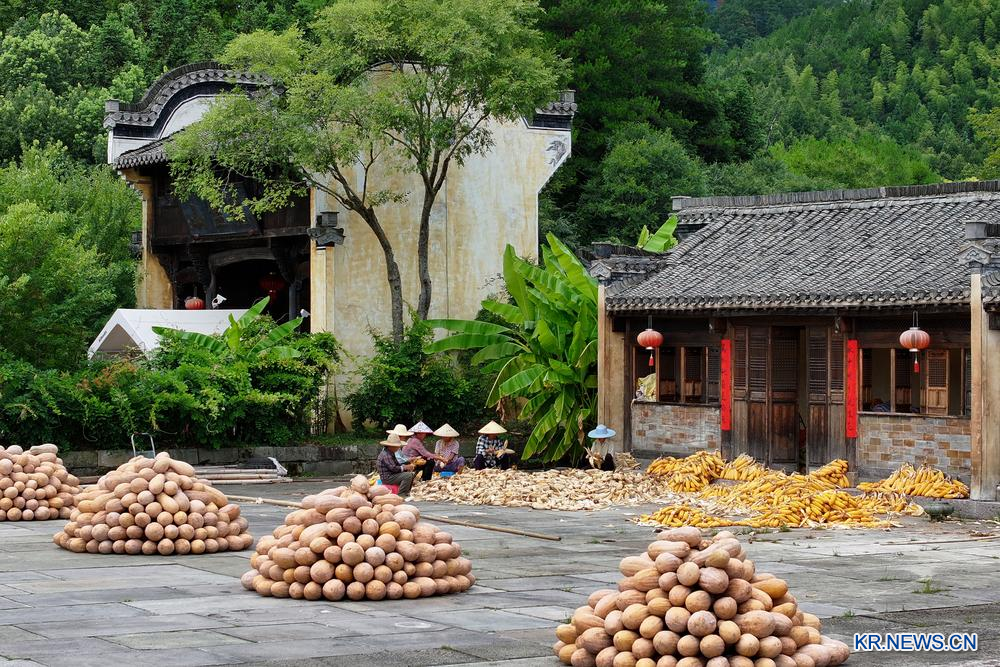 [신화망 베이징 8월8일] 7일 안후이(安徽)성 황산(黃山)시 후이저우(徽州)구 청칸(呈坎)촌 주민이 농작물을 햇볕에 말리는 장면을 드론 사진에 담았다.