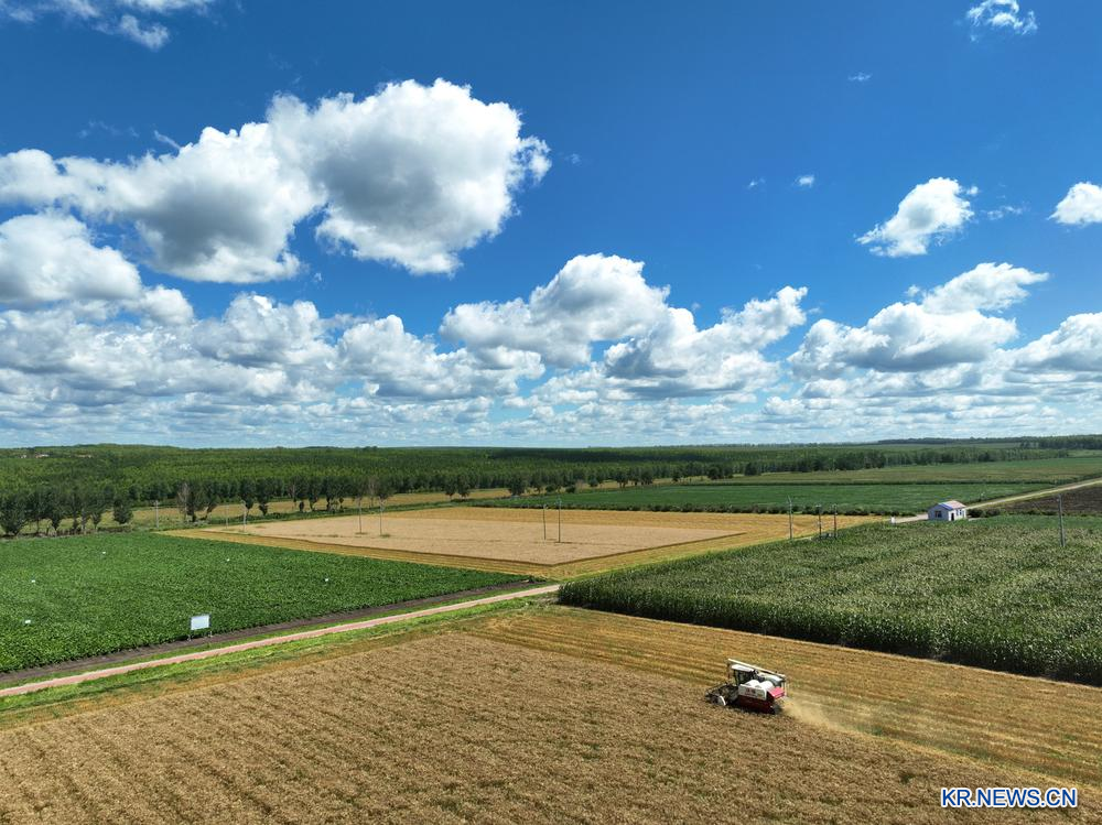이날 밀 수확이 한창인 헤이룽장(黑龍江)성 눙컨(農墾)과학원 93과학혁신센터를 드론으로 포착했다. 2025.8.7