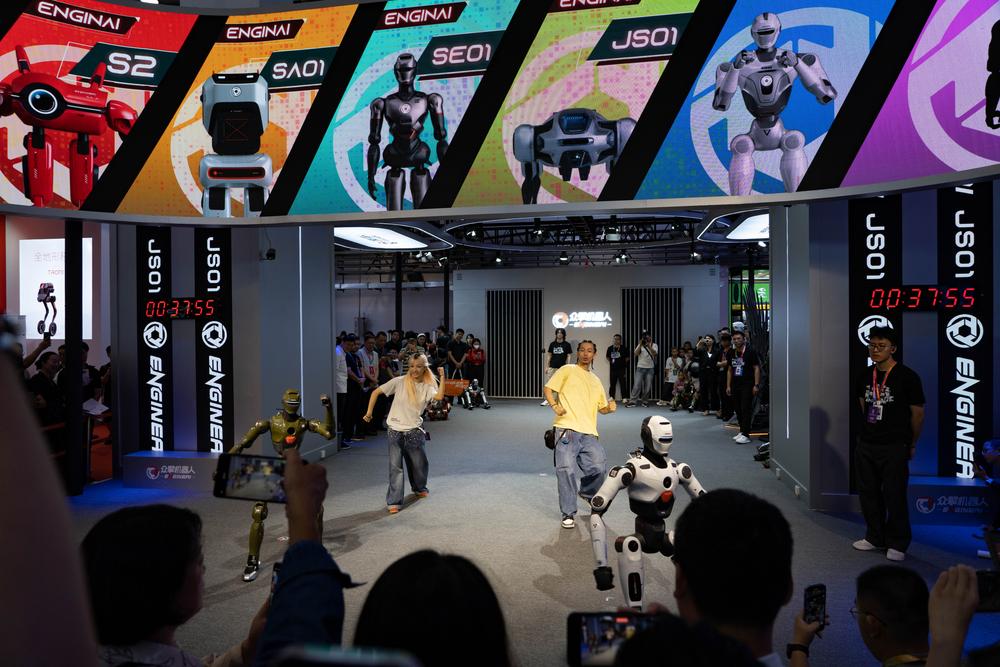 이날 '2025 세계로봇대회'에서 직원과 로봇이 함께 스트리트댄스를 추고 있다. 2025.8.8