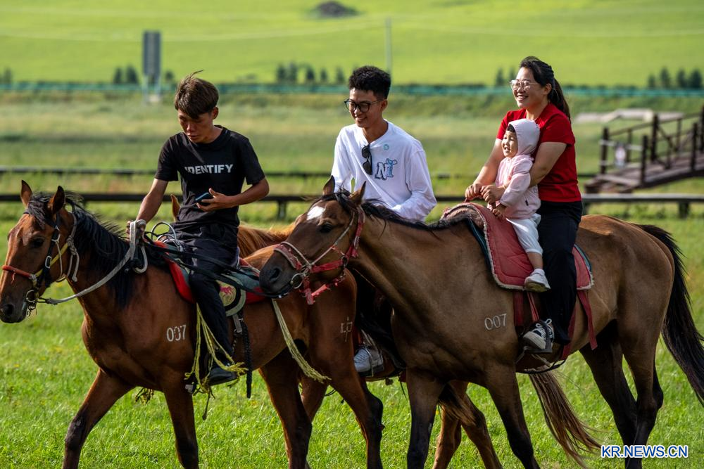 관광객이 9일 네이멍구(內蒙古)자치구 싱안(興安)맹 우란마오두(烏蘭毛都) 초원에서 승마를 즐기고 있다.