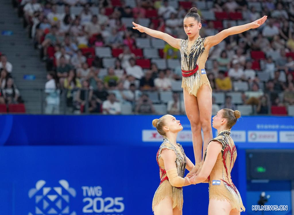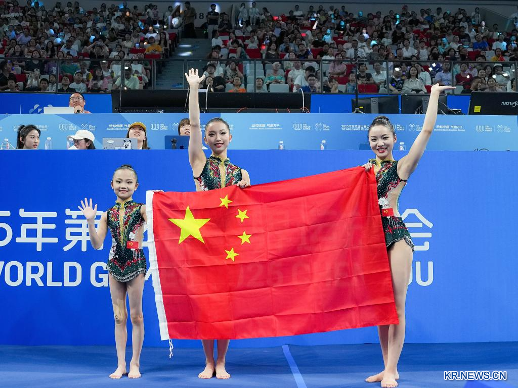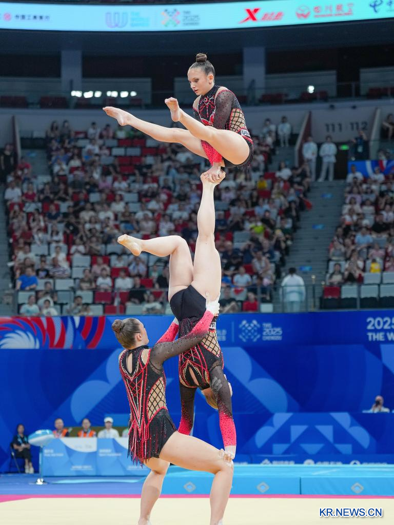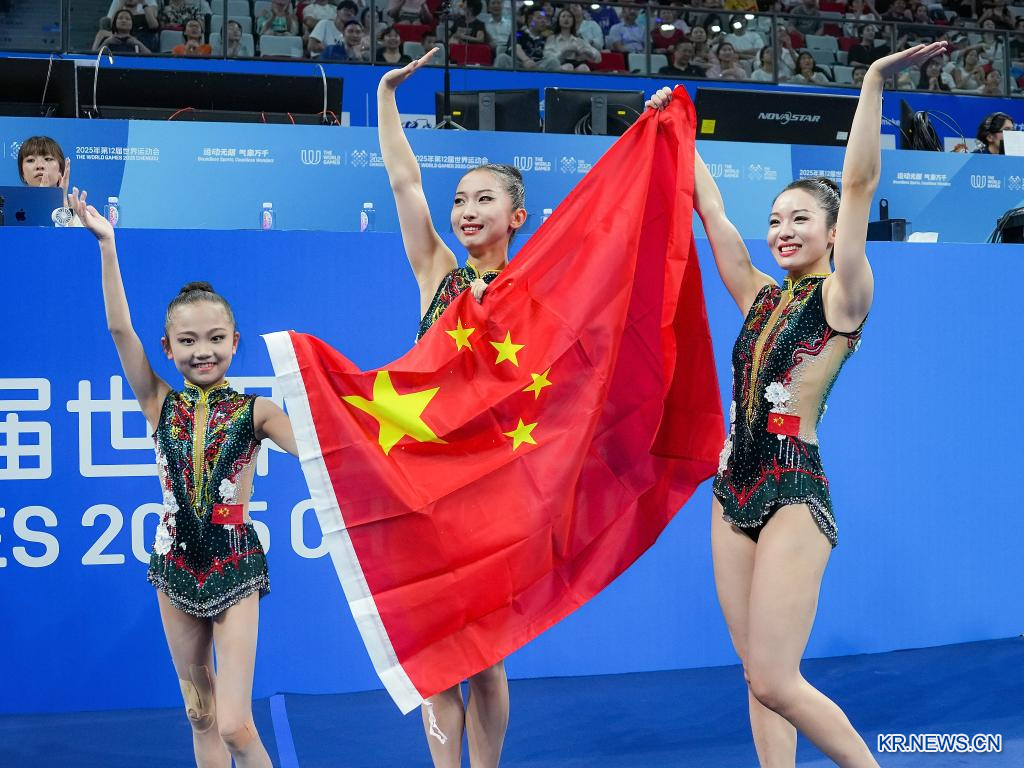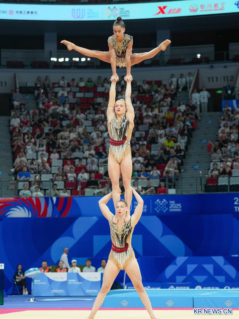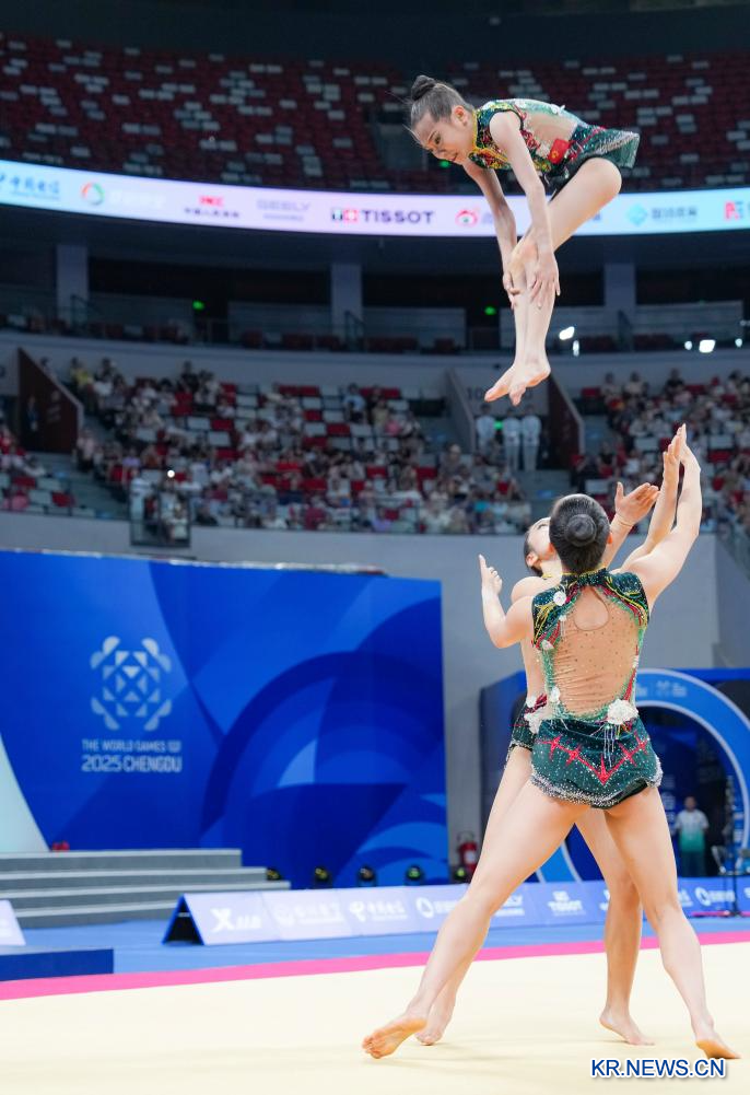 9일 청두에서 열린 '제12회 월드게임' 아크로바틱 여자 단체(3인조) 결승에서 중국팀이 최종 우승을 차지했다.[촬영/신화사 기자 왕시(王曦)]
