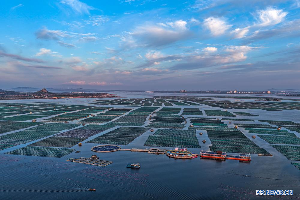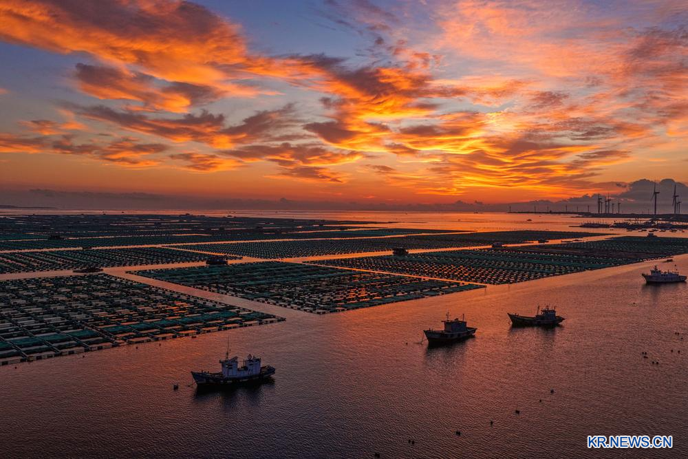 10일 아침 노을이 드리워진 산둥(山東)성 룽청(榮成)시 스다오(石島)관리구 쌍거우완(桑溝灣) 해역 생태 가두리 양식장을 드론 사진에 담았다.