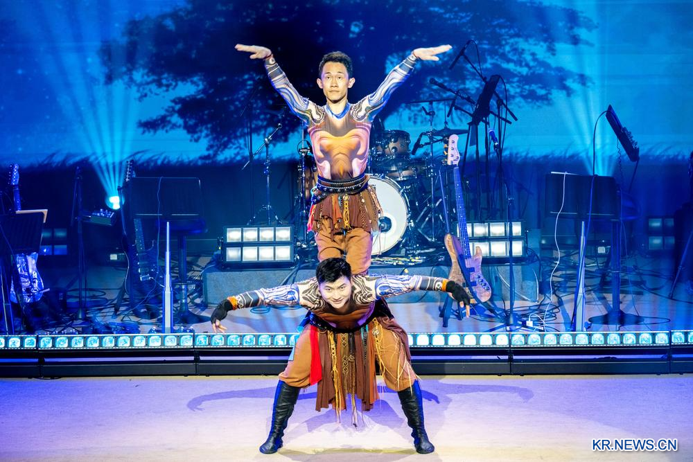 [신화망 싱안맹 8월11일] 연기자가 9일 무대에서 멋진 곡예 공연을 펼치고 있다.