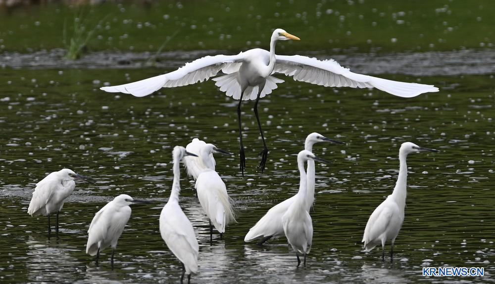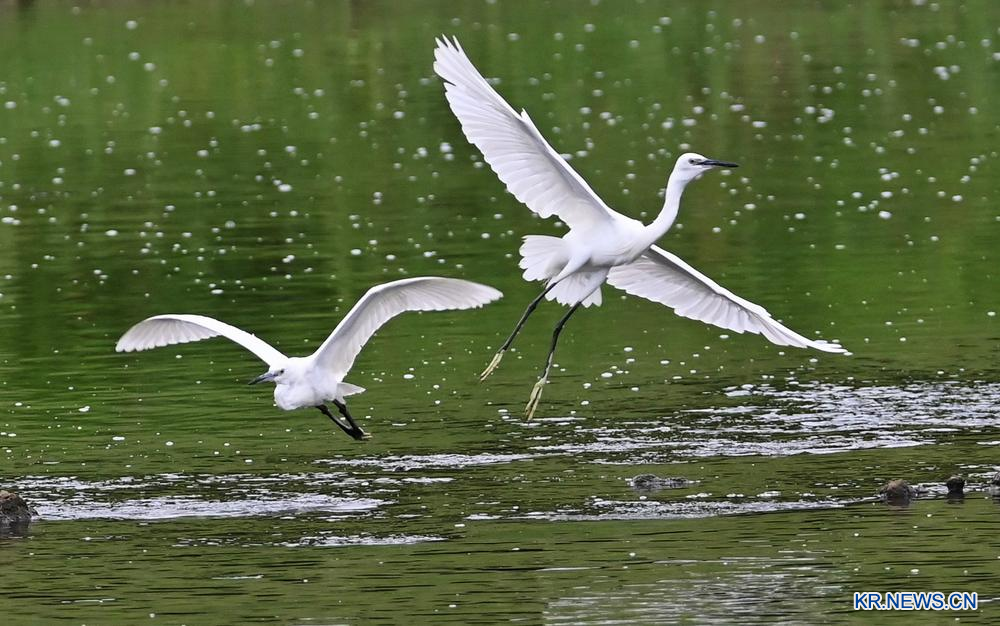 백로들이 10일 산둥(山東)성 텅저우(滕州)시 징허(荊河)수역에서 날갯짓하는 모습을 촬영했다. 2025.8.11
