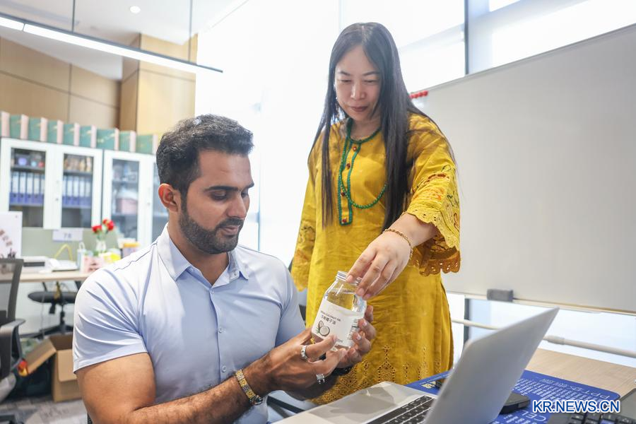 [신화망 하이커우 8월12일] 한 파키스탄 청년이 하이난(海南)성 싼야(三亞)시 야저우완(崖州灣)과학기술성의 한 사무실에서 유창한 중국어와 영어로 질문에 대답하고 있다. 싼야에서 외국인 대상 컨설팅 사업을 하고 있는 무하마드 아미르 셰자드가 하이난 이주를 계획 중인 외국인을 위해 답변 중이다. 그는 주변 외국인 사이에서 '걸어 다니는 지도'로 불릴 정도로 현지에서 가교 역할을 톡톡히 하고 있다.
