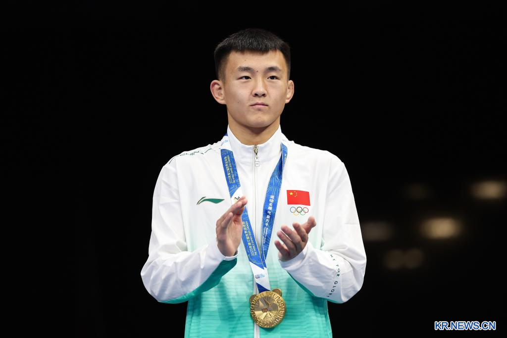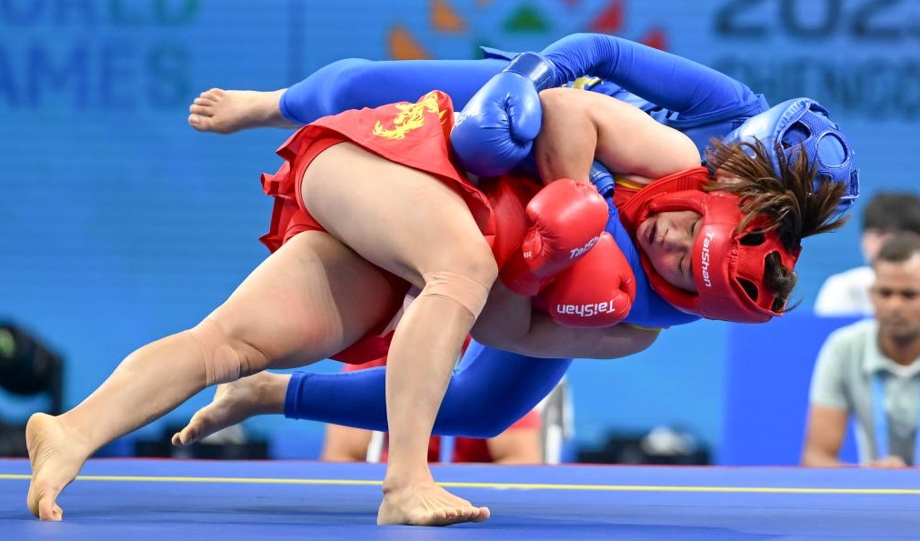 12일 2025 청두 월드게임 우슈 남자 산타 56kg급 결승에서 탕쓰숴(중국)가 베트남 선수를 꺾고 금메달을 목에 걸었다.[촬영/신화사 기자 쉬쑤후이(徐速绘)]pagebreak