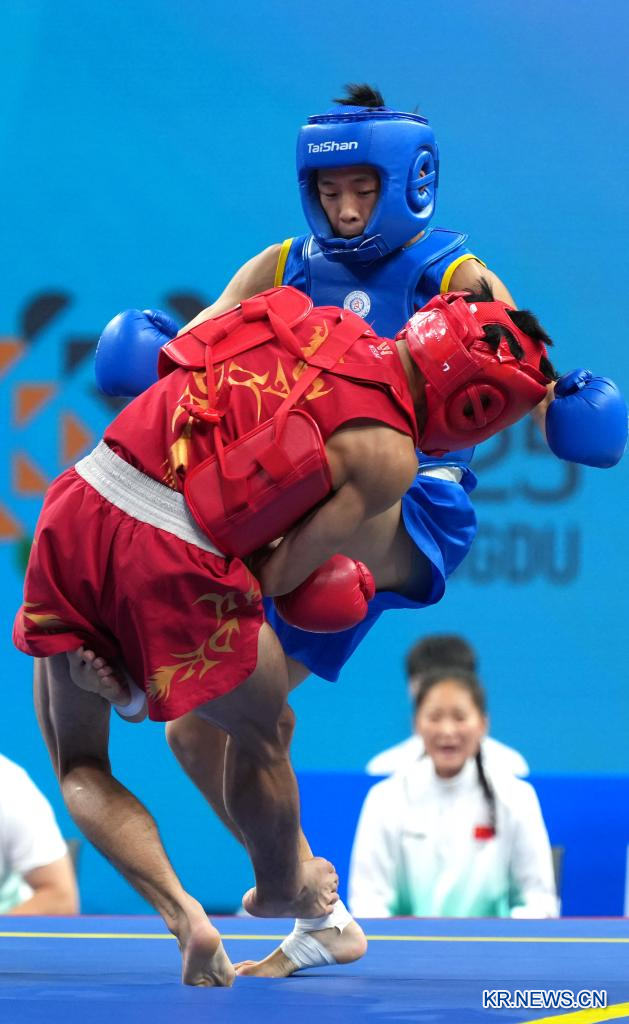 12일 2025 청두 월드게임 우슈 남자 산타 56kg급 결승에서 탕쓰숴(중국)가 베트남 선수를 꺾고 금메달을 목에 걸었다.[촬영/신화사 기자 천빈(陳斌)] pagebreak