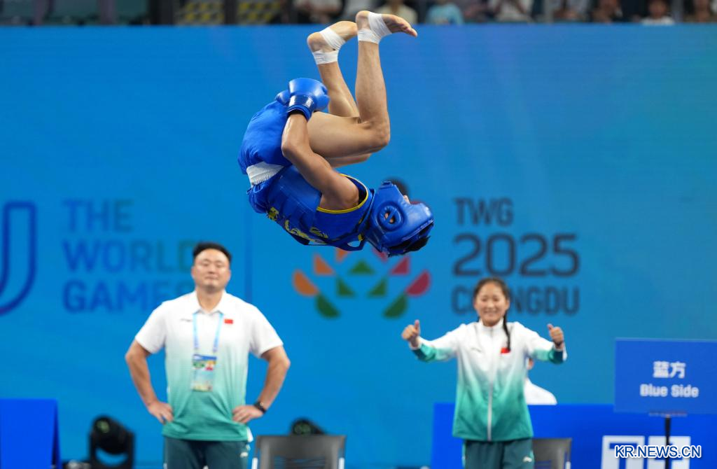12일 2025 청두 월드게임 우슈 남자 산타 56kg급 결승에서 탕쓰숴(중국)가 베트남 선수를 꺾고 금메달을 목에 걸었다.[촬영/신화사 기자 쉬쑤후이(徐速绘)]
