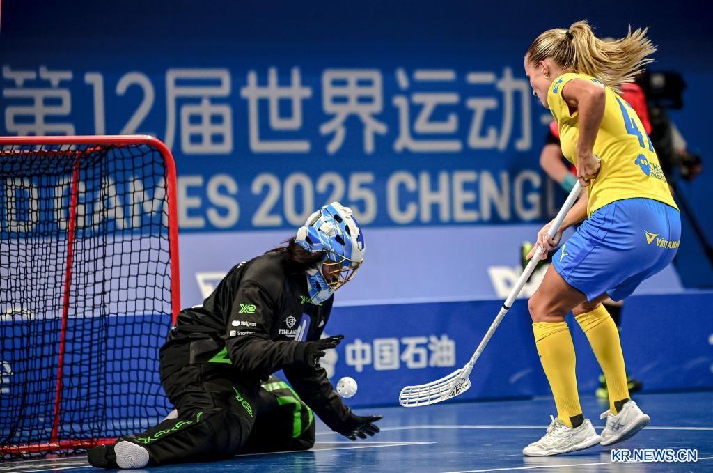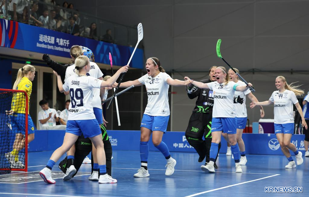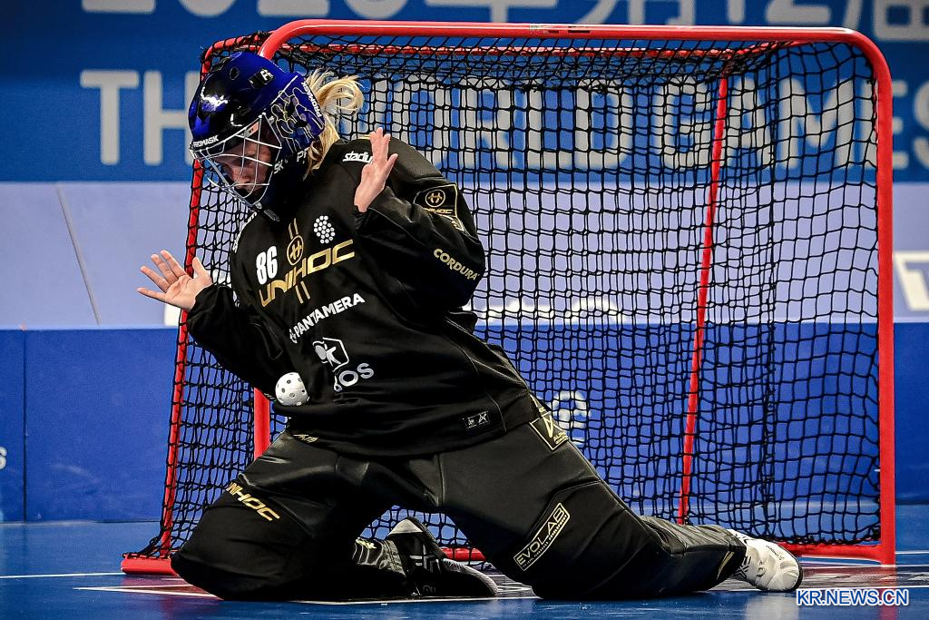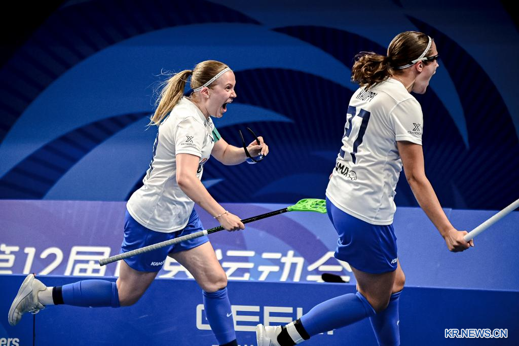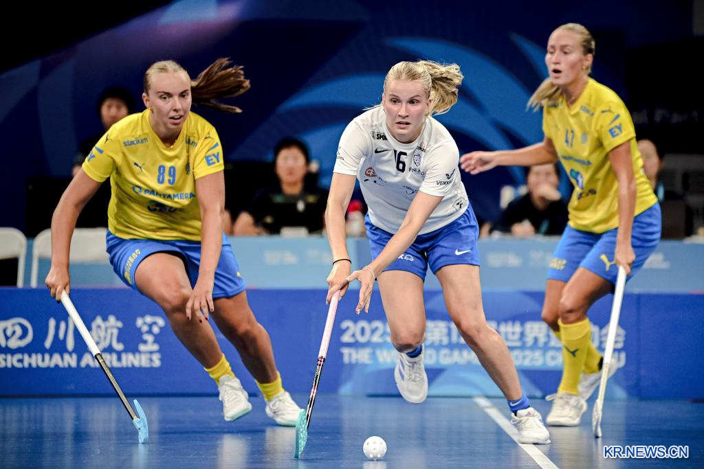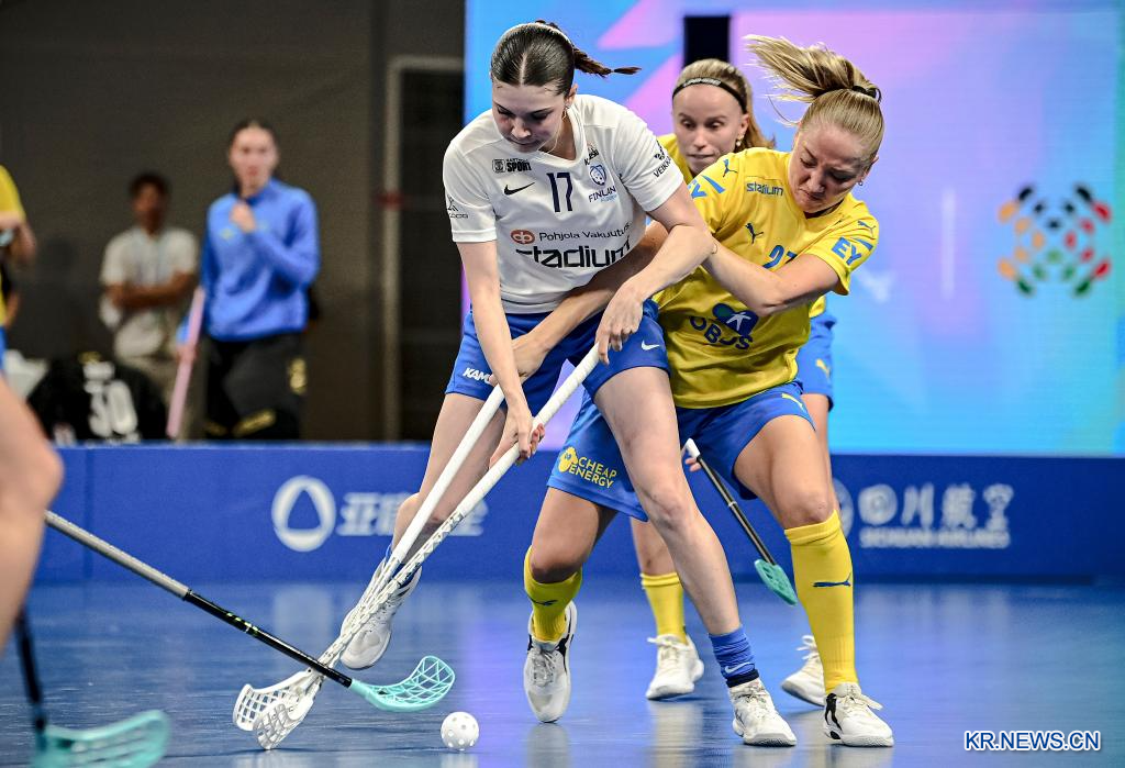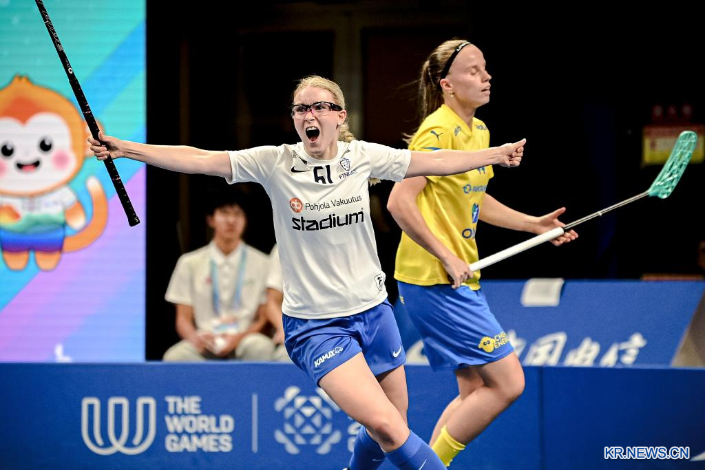 13일 쓰촨(四川)성 청두(成都)시에서 열린 '제12회 월드게임' 플로어볼 여자부 결승전에서 핀란드가 스페인을 누르고 금메달을 목에 걸었다.