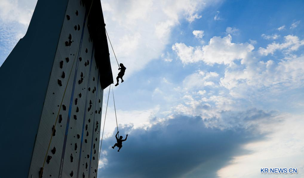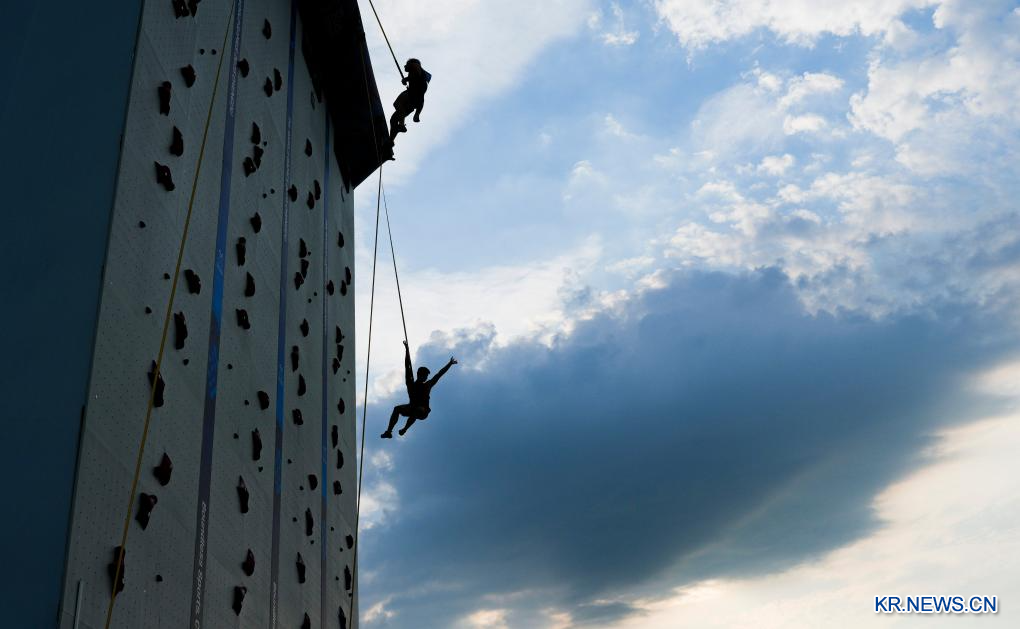 [신화망 청두 8월15일] 14일 쓰촨(四川)성 청두(成都)시에서 열린 '제12회 월드게임' 스포츠클라이밍 남자 스피드 개인전에서 중국 선수 추서우훙(儲守宏)이 금메달을 확정한 뒤 우승을 기뻐하고 있다.