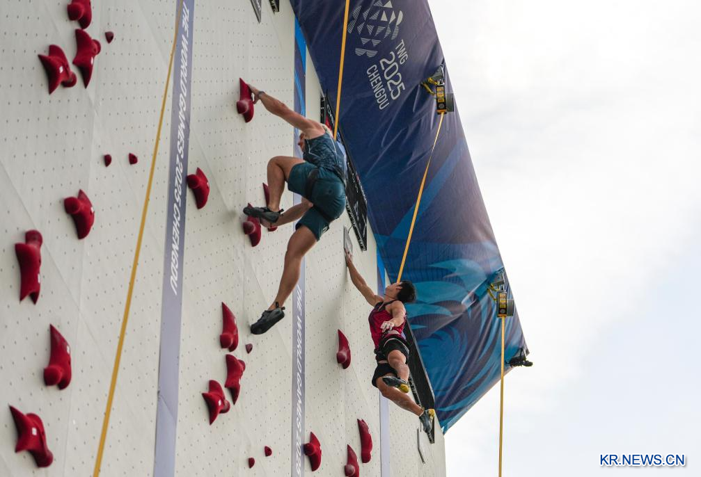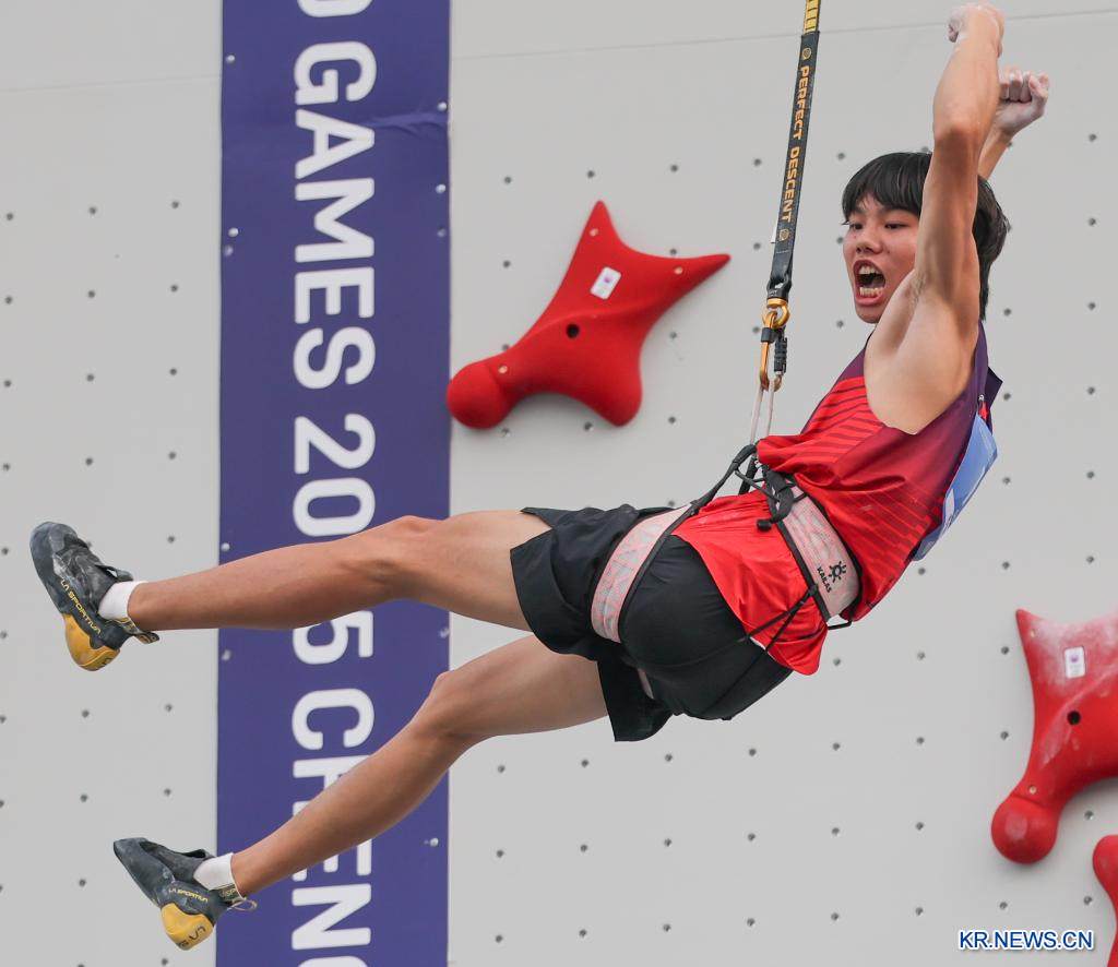 14일 쓰촨(四川)성 청두(成都)시에서 열린 '제12회 월드게임' 스포츠클라이밍 남자 스피드 개인전에서 중국 선수 추서우훙(儲守宏)이 금메달을 획득했다.